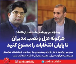 سردبیر روزنامه باختر با ارائه پیشنهادی به استاندار کرمانشاه، خواستار ممنوعیت هرگونه عزل و نصب مدیران تا پایان انتخابات شد.