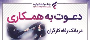 بانک رفاه کارگران بهمنظور تامین بخشی از نیروی انسانی مورد نیاز خود در رده های شغلی ” تخصصی ستاد” ، ” تخصصی حوزه فناوری اطلاعات ” و ” بانکدار” و در رده شغلی “نگهبان” از بین متقاضیان واجد شرایط دعوت به همکاری میکند.