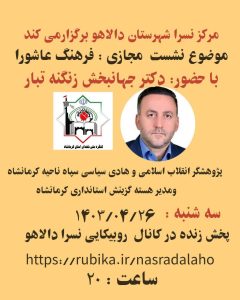 دکتر جهانبخش زنگنه تبار در شام غریبان حضرت ابا عبدالله الحسین(ع) دریک برنامه وبیناری با اقشار مختلف بسیجیان شهرستان دالاهو، دررابطه با فرهنگ عاشورا،اهداف قیام امام حسین(ع)،درس ها و عبرت های عاشورا سخنرانی کرد.